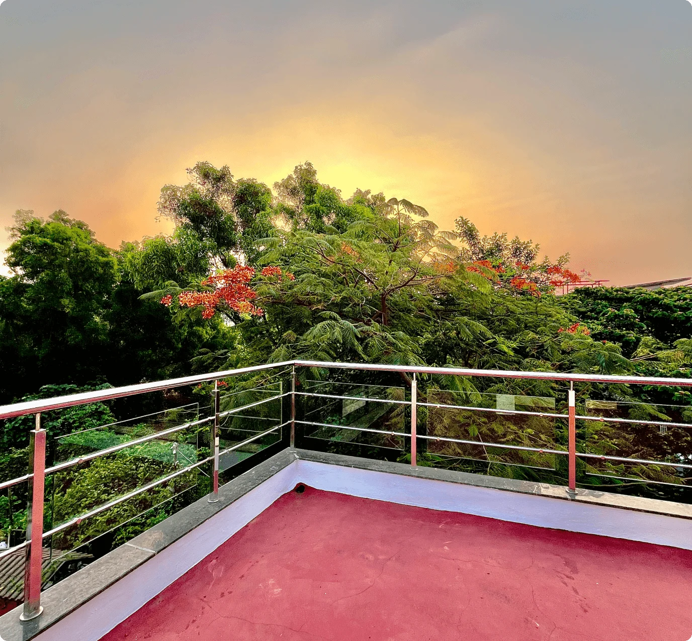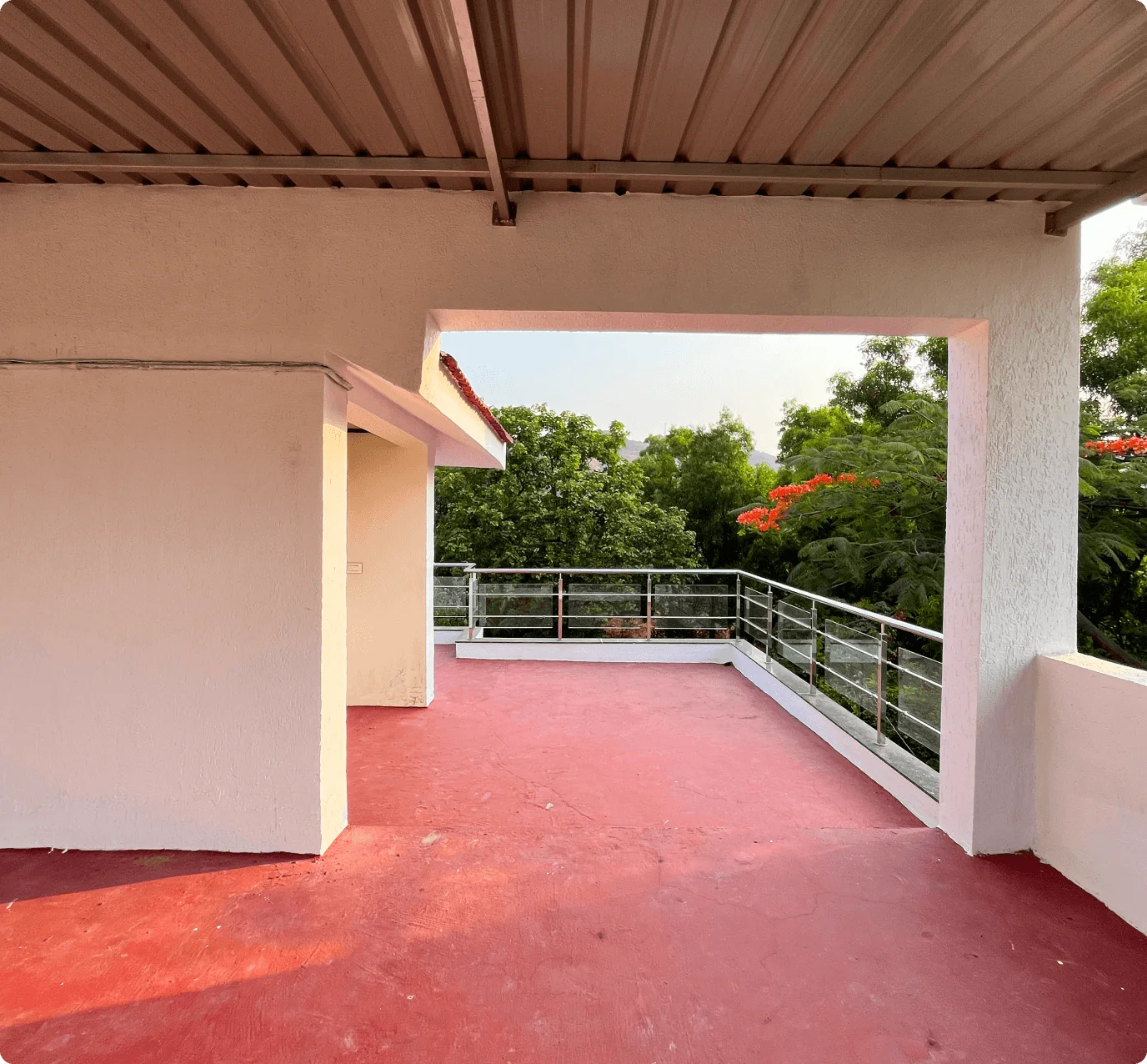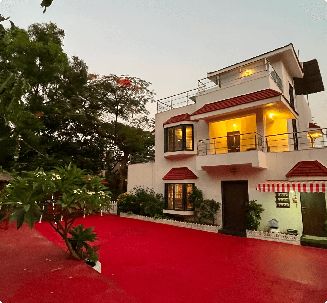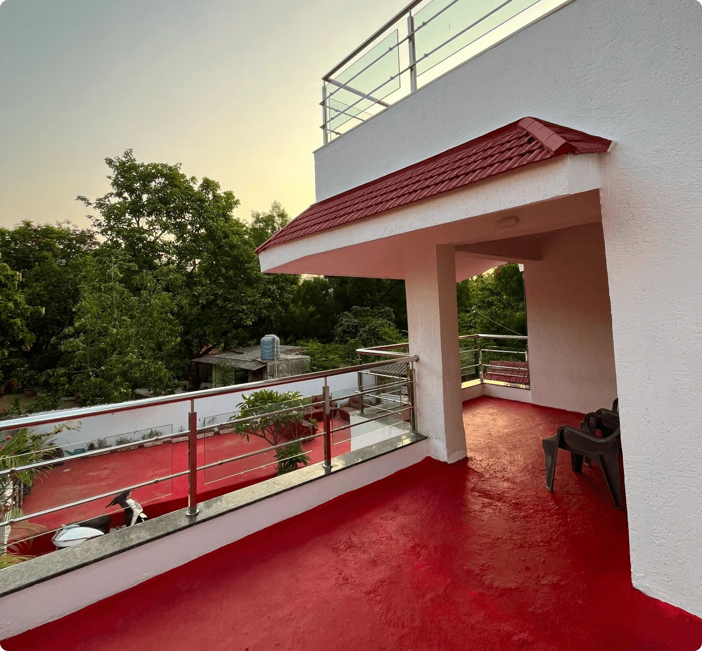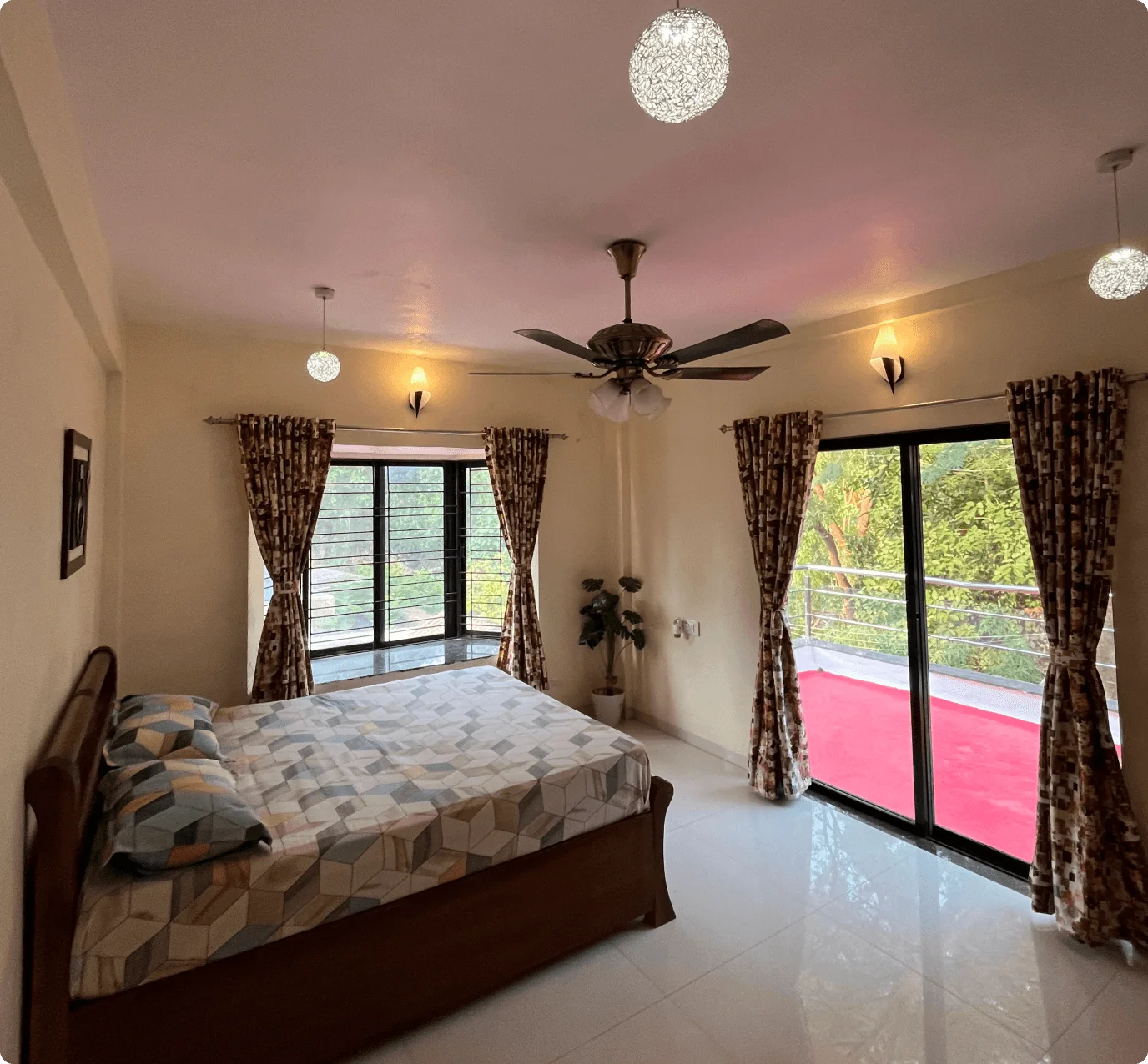 Each air-conditioned bedroom includes premium bedding, wardrobes, and balconies with serene views. The expansive terrace features shaded and open areas for relaxation, sunsets, or stargazing.