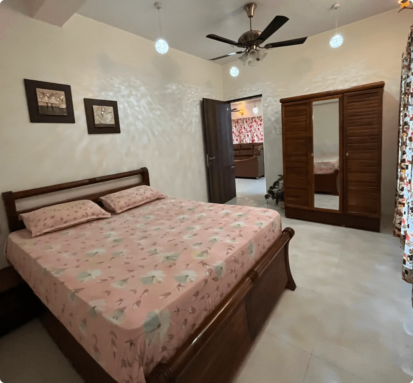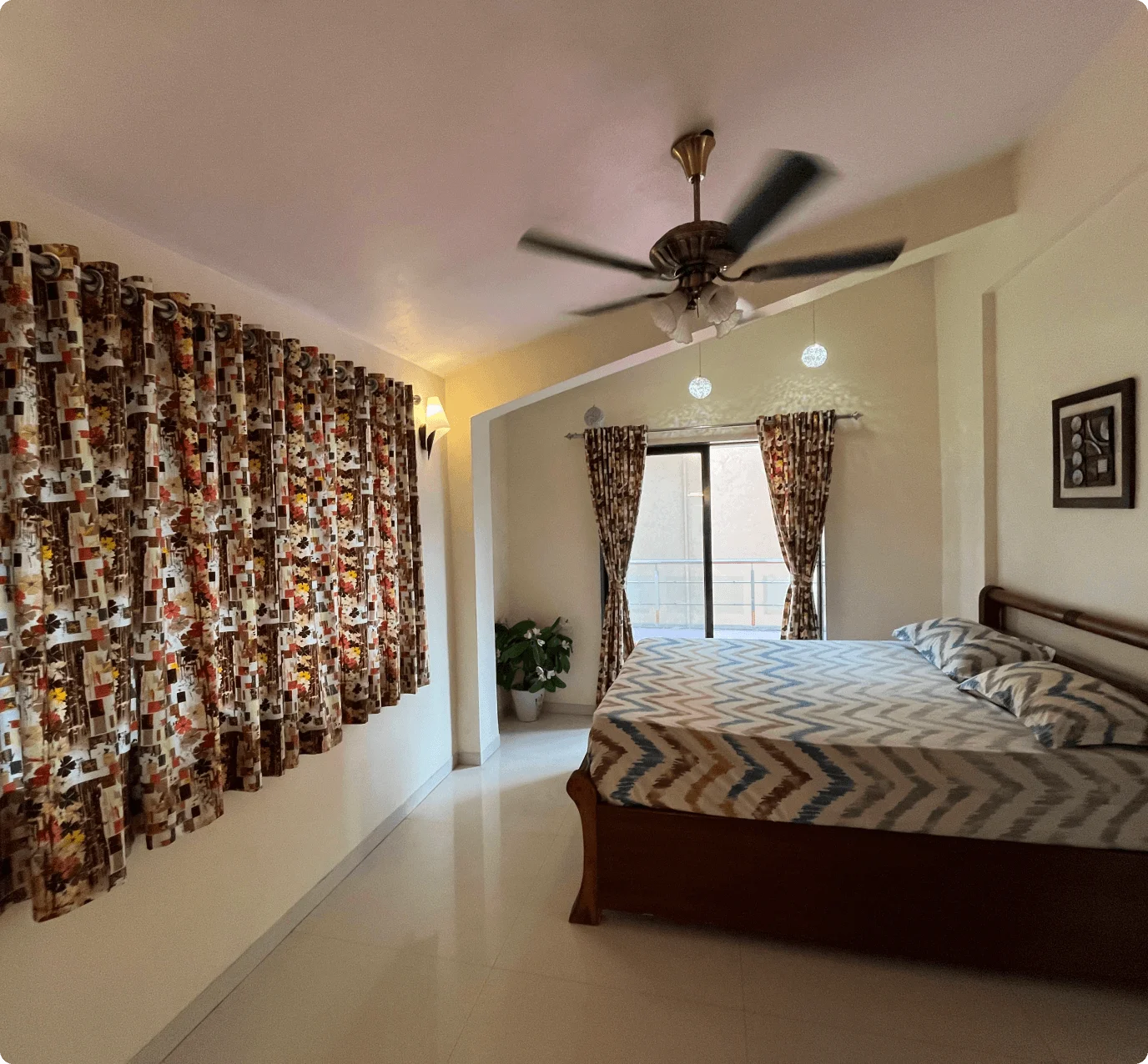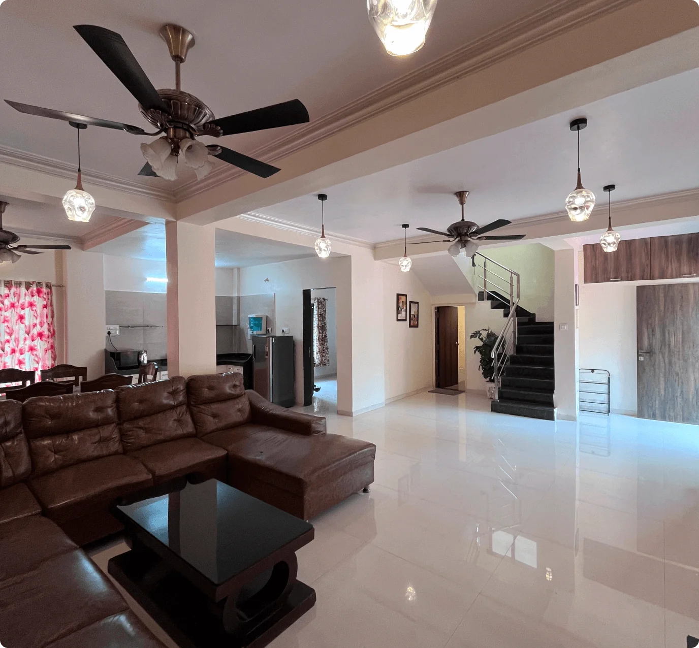 The living room boasts cozy sofas, an LED TV, music system, Wi-Fi, and an attached bathroom. The fully-equipped kitchen includes a refrigerator, microwave, and water purifier for meal prep. An on-site caretaker handles housekeeping and can prepare meals on request (extra charges). Located 12 minutes from Lonavala’s main market, guests can enjoy nearby restaurants or order food to the villa.