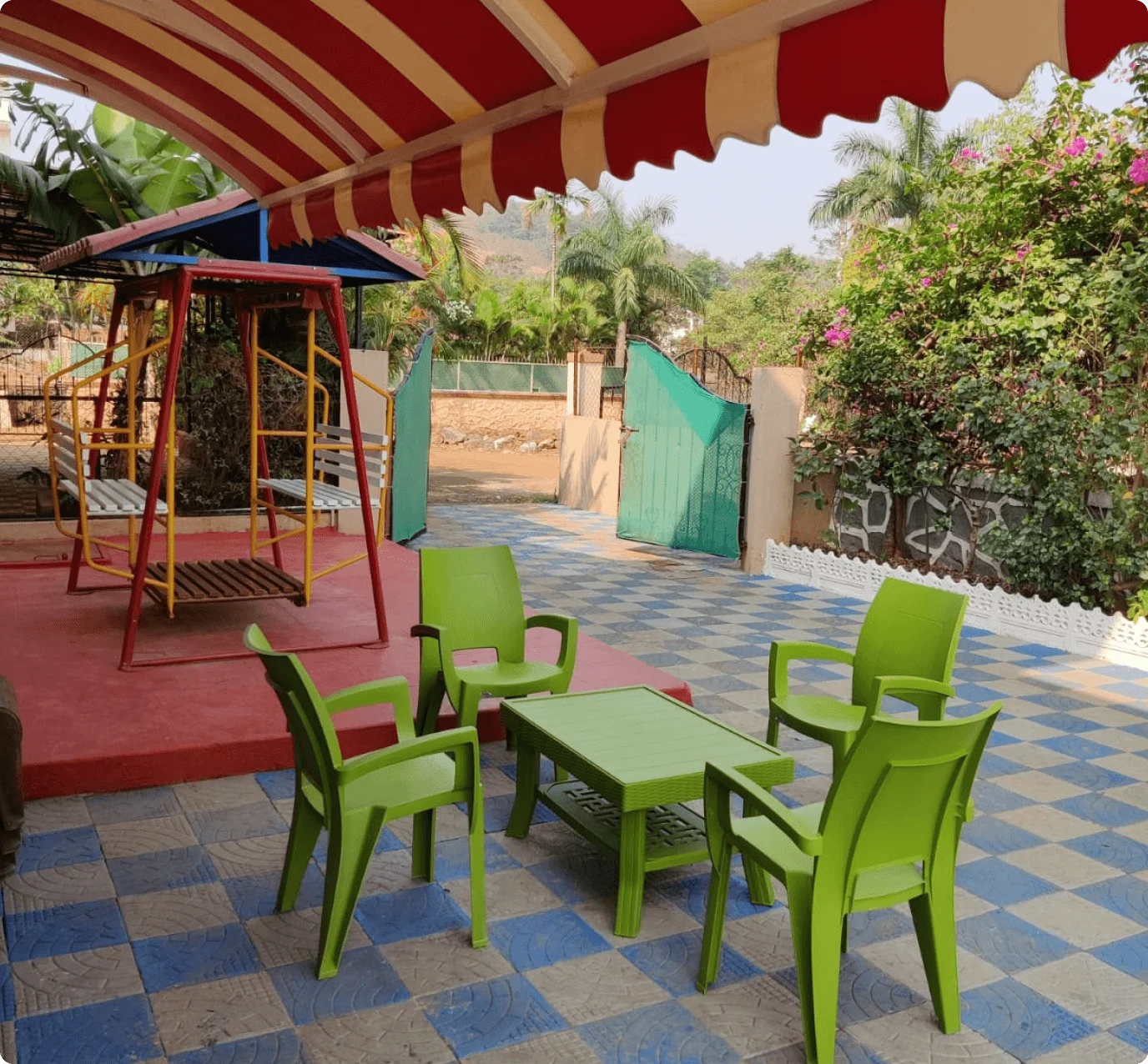 The villa grounds include a garden, tea spot, and a swing, creating a serene retreat. A backup inverter ensures uninterrupted comfort.